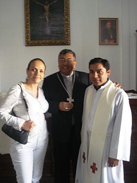P. Juan Damiani Ovalle y Cristina Callejas, miembros de la Subcomisión de VIH, con Mons. Oscar Julio Vian Morales |
