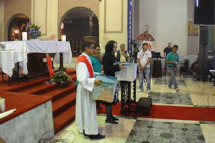 Durante la celebración de la Sagrada Eucaristía y la Hora Santa, se ofrecieron en el Altar las peticiones que de todas las diócesis fueron presentadas. Cristina Callejas y P. Mynor Morataya de la Subcomisión de VIH las muestran a la feligresía. |