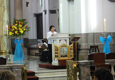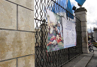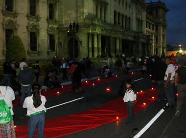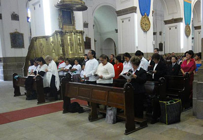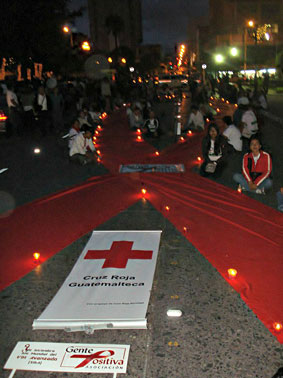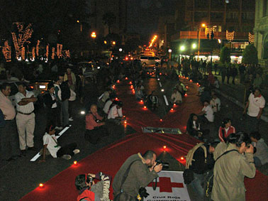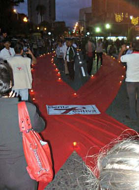 Al finalizar la celebración de la Eucaristía, los asistentes formaron frente al Palacio de la Cultura el listón rojo, símbolo internacional de solidaridad y compromiso en el trabajo para detener el sida |