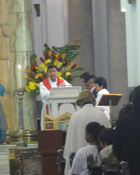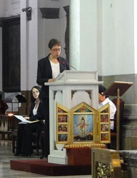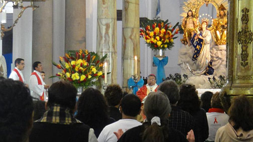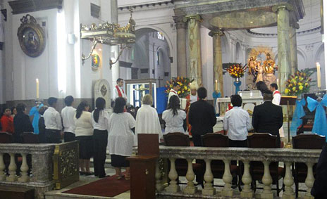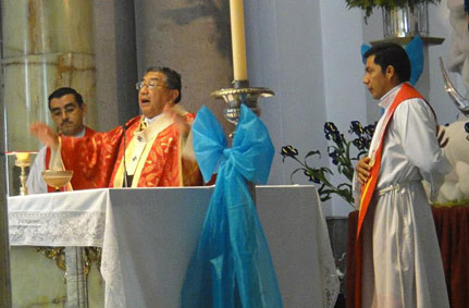Monseñor Oscar Julio Vian Morales, Arzobispo de Santiago de Guatemala presidió la Eucaristía. A la izquierda, P. Mynor Morataya, asesor pastoral y espiritual de la Subcomisión de VIH; a la derecha, P. Damiani Ovalle, de la Arquidiócesis de Los Altos |