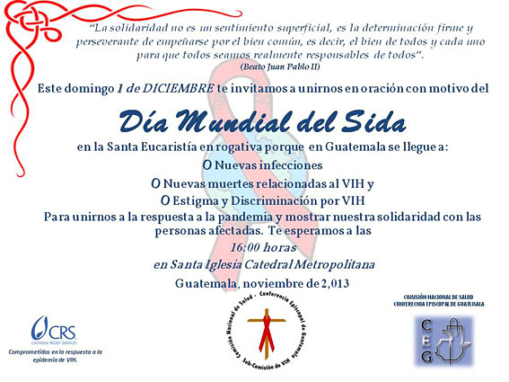 1 de diciembre, Día Mundial del Sida Año 2013 Carta de Monseñor Pablo Vizcaíno Prado, Obispo de Suchitepéquez-Retalhuleu Presidente de la Comisión Nacional de Salud y Subcomisión de VIH Mensaje de Monseñor Oscar Vian Morales, sdb, Arzobispo de Santiago de Guatemala Audio de convocatoria
